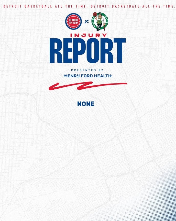 赛前,活塞官方更新球队伤病报告,全员健康,均可以出战。